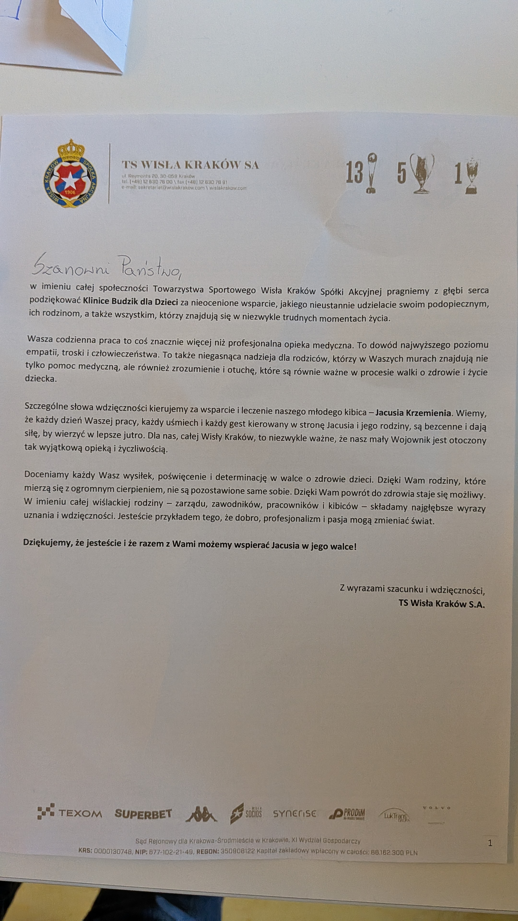 We also received a T-shirt signed by Wisła Kraków players and a very kind thanks.