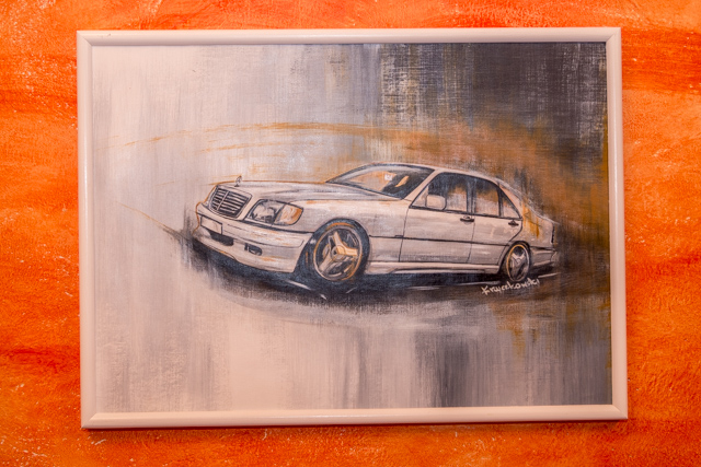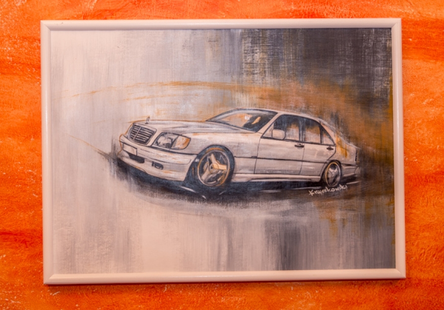 Mercedes S – Samochód, którego opracowanie konstrukcji kosztowało ponad miliard dolarów. Obraz malowany techniką akrylową przez Piotra Krzyczkowskiego przedstawia jeden z czterech Mercedesów z kolekcji rapera TEDE.