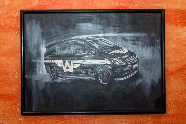 Mercedes Viano – Pojemny VAN idealny środek transportu dla TEDE i Ekipy Wielkie Joł. Obraz malowany techniką akrylową przez Piotra Krzyczkowskiego przedstawia jeden z czterech Mercedesów z kolekcji rapera TEDE. Monochromatyczne kolory obrazu nawiązują do odblaskowych elementów umieszczonych na aucie.